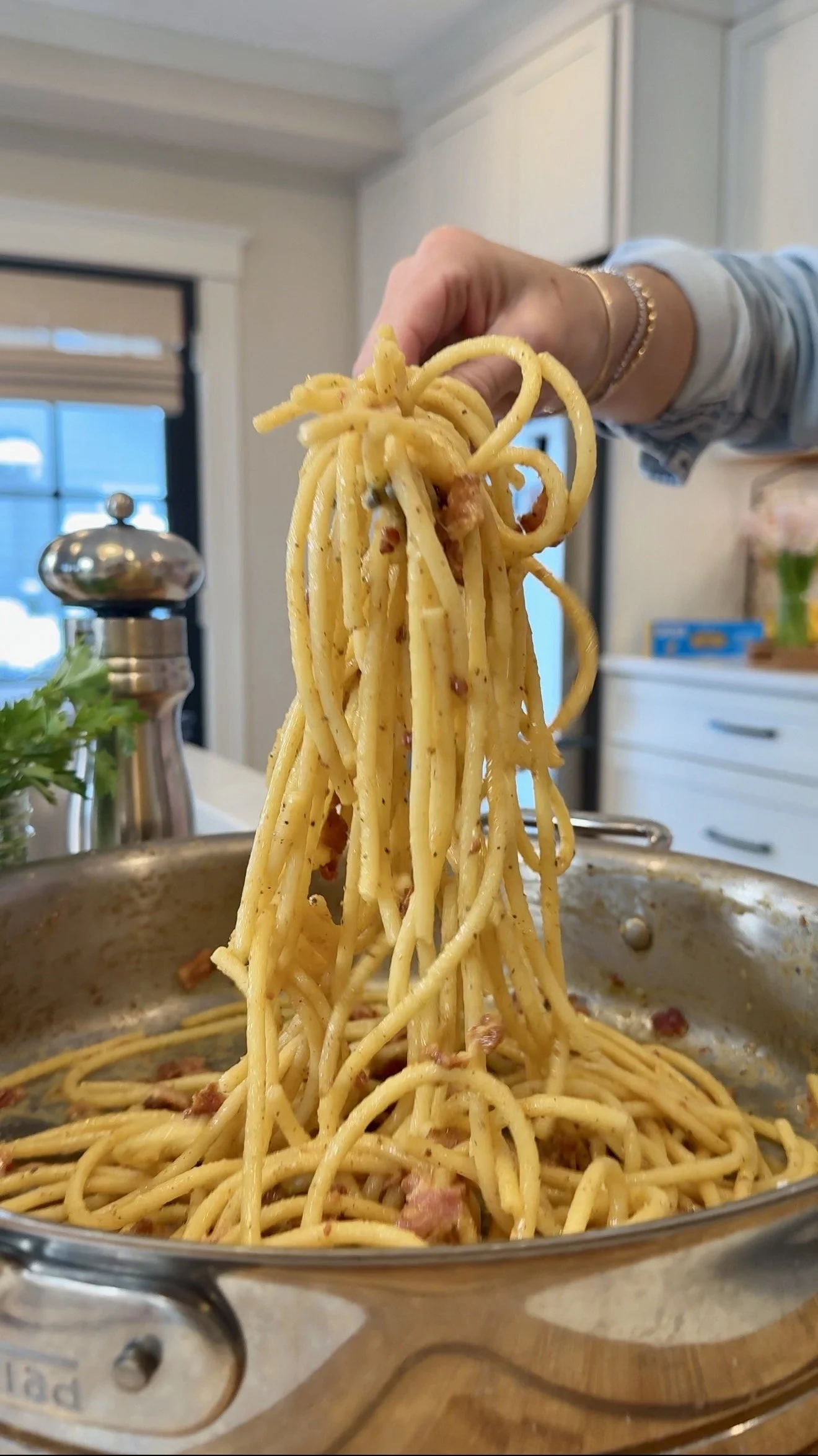 This classic recipe for authentic Italian comfort food is tried and true. No butter, no cream, no garlic . . . just a few simple, quality ingredients that you probably have on hand. My dad swears you have to go the traditional Italian way and use guanciale, but I’m here to tell you that regular bacon works just fi ne. And a busy weeknight is no time to be on a wild goose chase looking for pork cheek! So, bacon it is. By the time the pasta is boiled, this whole dish is as good as done. It’s super easy, but timing and method are very important, so I need you to focus for 10 minutes. Capeesh?