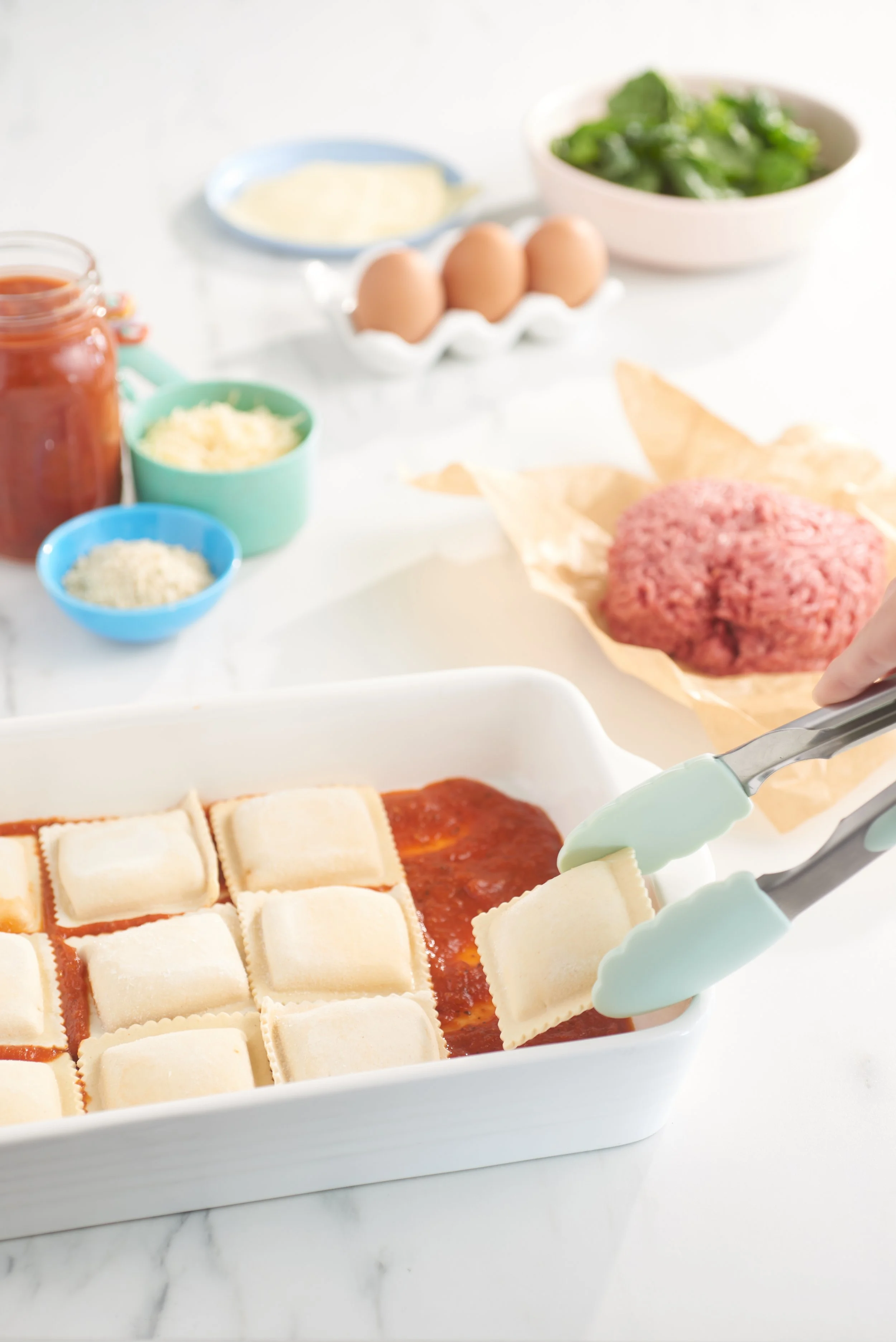 Lasagna involves a lot of TLC and that’s part of what makes it so special. I’m happy to take the time and energy to prepare a good old fashioned lasagna on a holiday or even on a Sunday, but mama has no time for that on a weeknight! So, I found a way to streamline the process and still get all the same great flavor by using frozen cheese raviolis instead of cooked lasagna noodles. No need to precook them at all! Just line the raviolis up in your dish and let the oven do the work for you!
